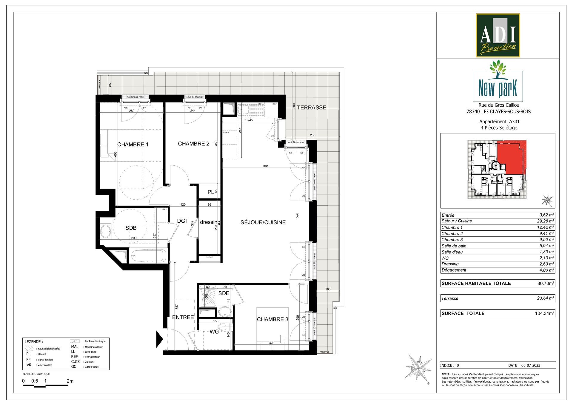 Situé au 3ème et dernier étage, accessible par ascenseur, cet appartement T4 de 80,7 m² comprend : une entrée avec placard/dressing et WC séparés, un séjour (29,28 m²) orienté Nord-Ouest avec un espace cuisine ouvert à aménager, une chambre parentale avec salle d'eau privée, deux chambres et une salle de bains. Il comprend également une belle terrasse plein ciel de 23,64 m² avec une partie dinatoire (3m x 2,36 m), accessible depuis le séjour et toutes les chambres.