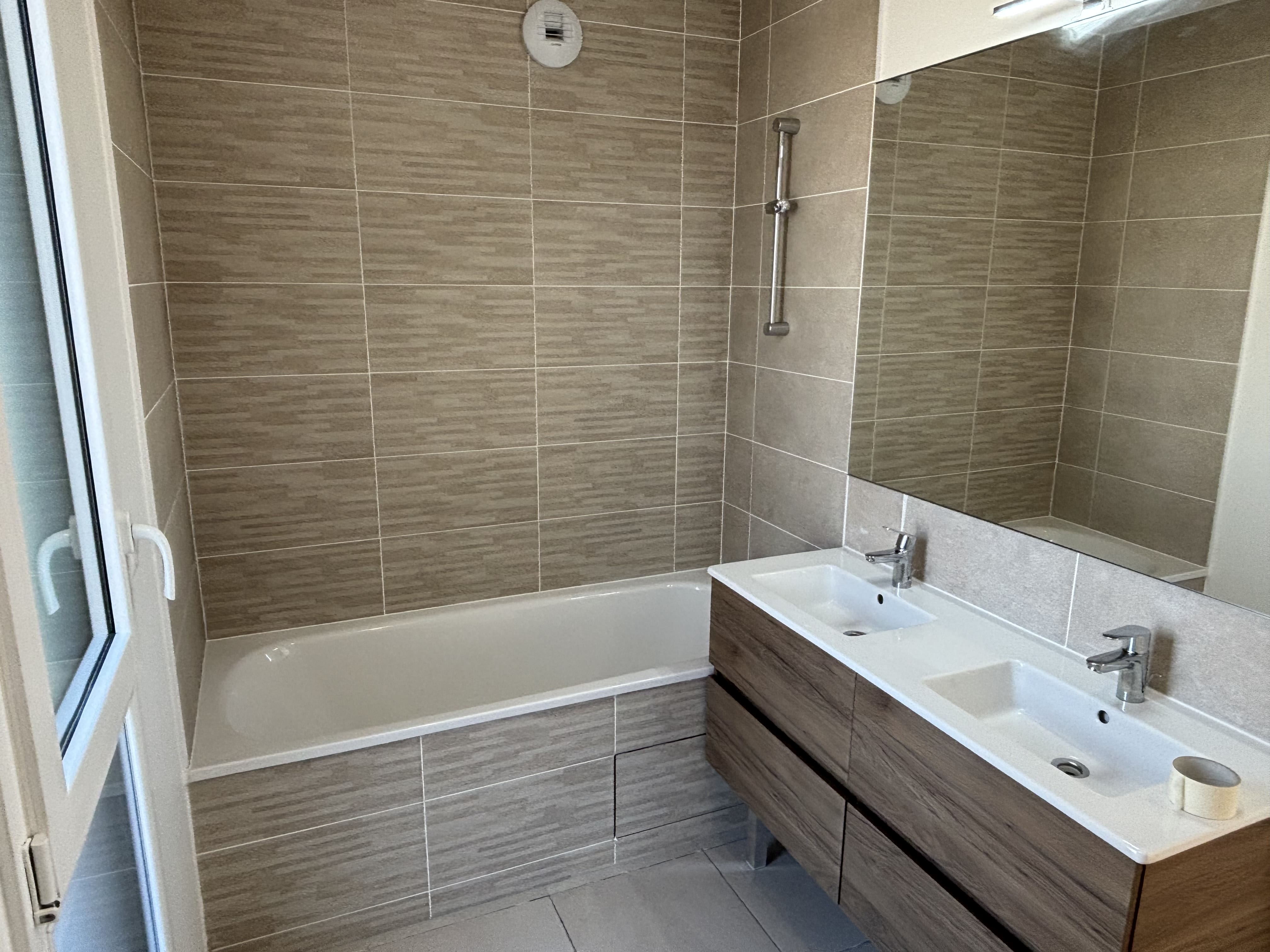 Carrelage en grès émaillé et faïence murale toute hauteur dans les pièces d'eau.